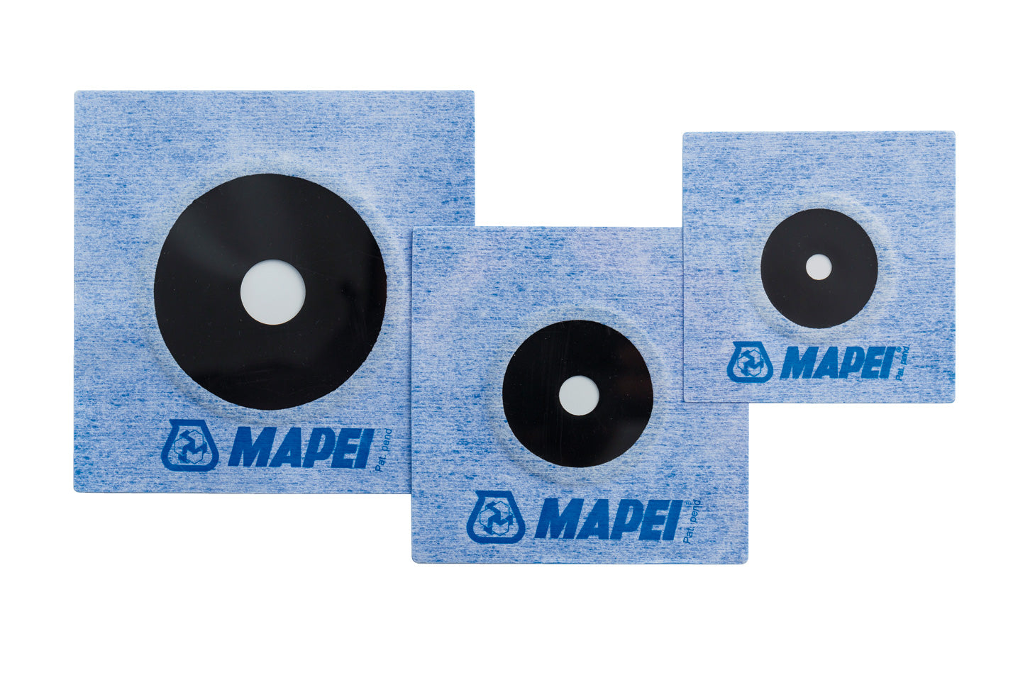 Three blue textured spacers with black and white circular centers and the MAPEI logo.