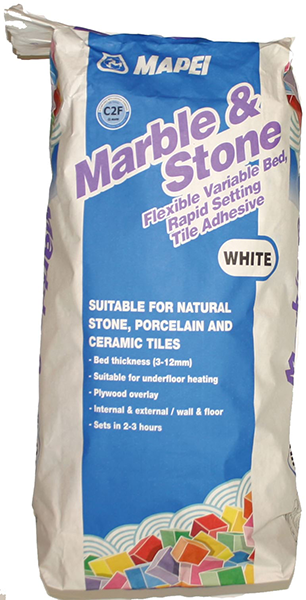 Mapei Marble & Stone is a high quality adhesive for the installation of marble and other natural stone tiles such as limestone, travertine, quartzite and sandstone. TECHNICAL CHARACTERISTICS Marble & Stone is a specially formulated polymer enhanced adhesive based on selected and matched binders, aggregates, synthetic resins and accelerators that develop high bond strength within 3 hours after mixing. This permits floor finishes to be completed quickly. Floors can be grouted and subjected to light foot traffic after 3 hours and are ready to receive pedestrian traffic after 24 hours. Once cured Marble & Stone is fully frost and weather resistant and therefore ideal for use on external walkways, balconies and terraces.