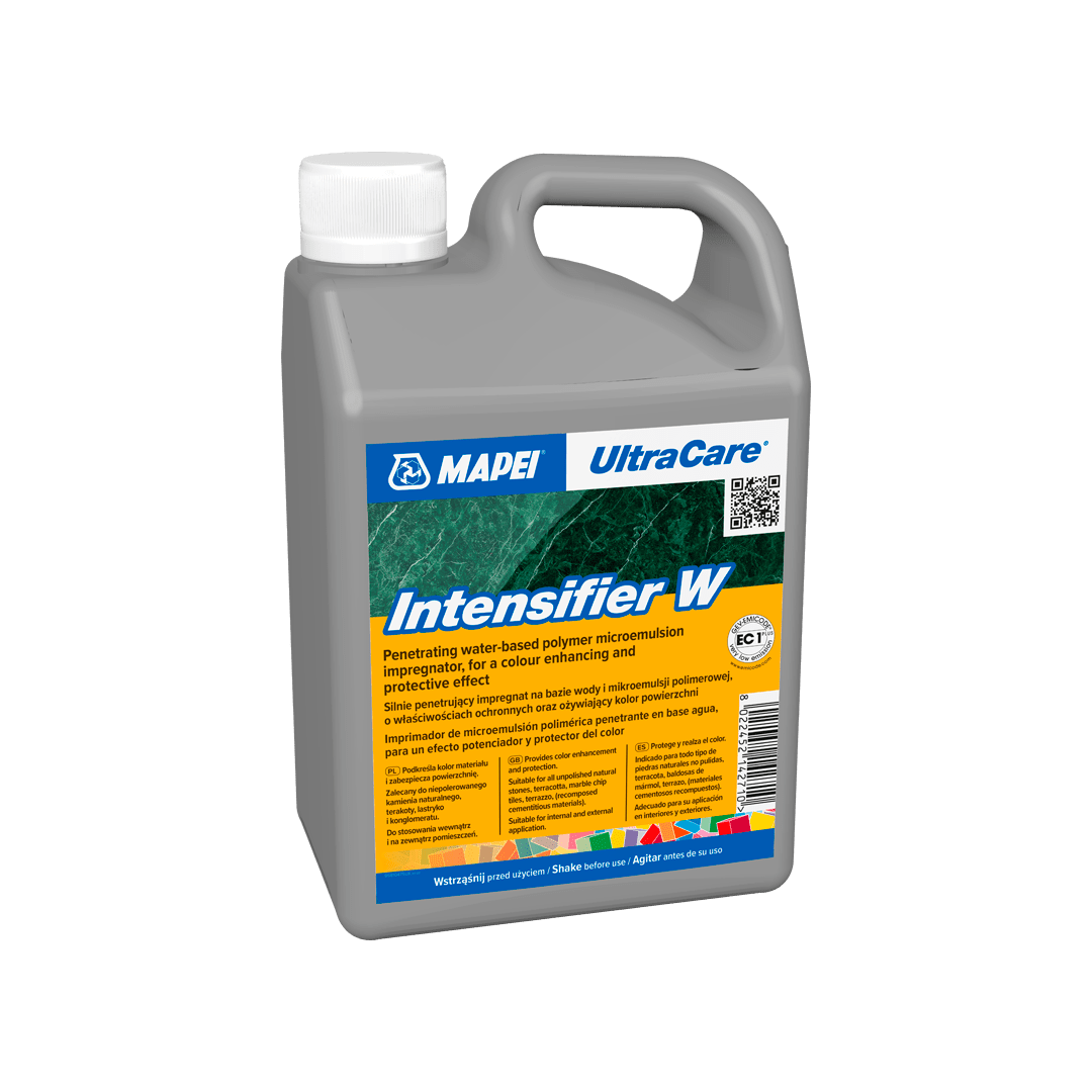 A container of MAPEI UltraCare Intensifier W, a water-based polymer impregnator.