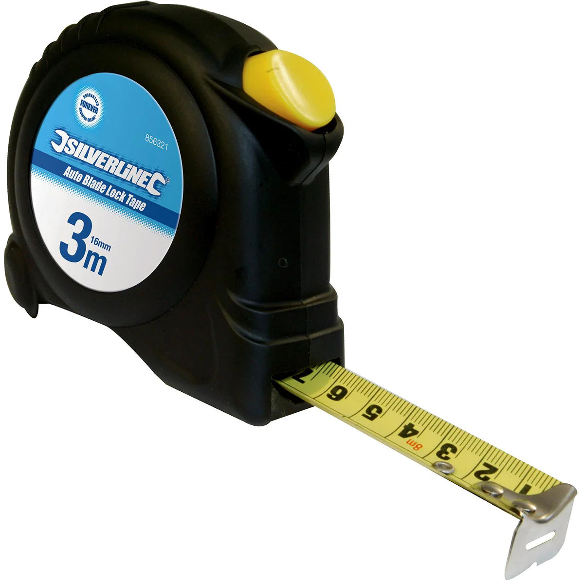 The Silverline 3M tape measure is equipped with a scratch-resistant nylon coated blade which is marked with clear metric graduations. This tape is also fitted with automatic lock when extended out and has a retraction button.